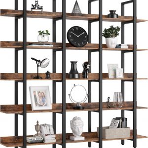 IRONCK Bookcase and Bookshelves Triple Wide 5 Tiers Large Open Shelves, Etagere Book Shelf with Back Fence for Home Office Decor, Easy Assembly, Vintage Brown
