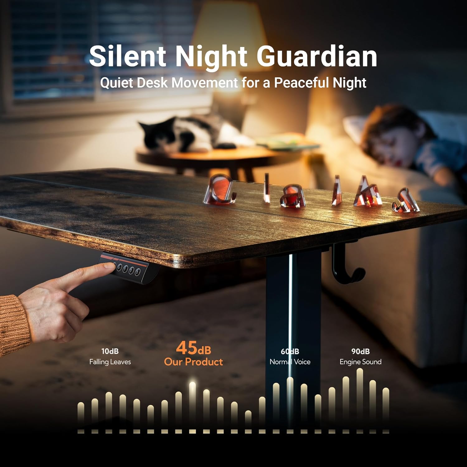 Smart Electric Lift System: Seamlessly transition from sitting to standing with a height range of 28.3″ to 46.5″. The quiet, high-performance motor operates at under 45 decibels, ensuring a peaceful work environment.
