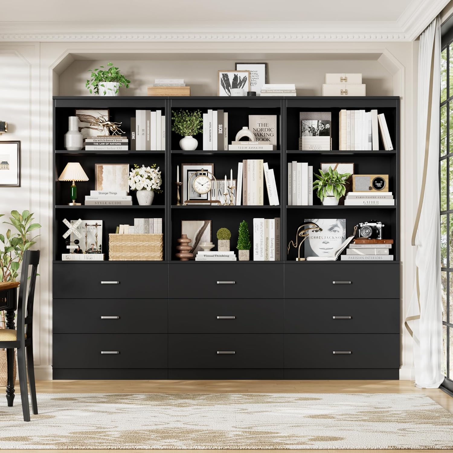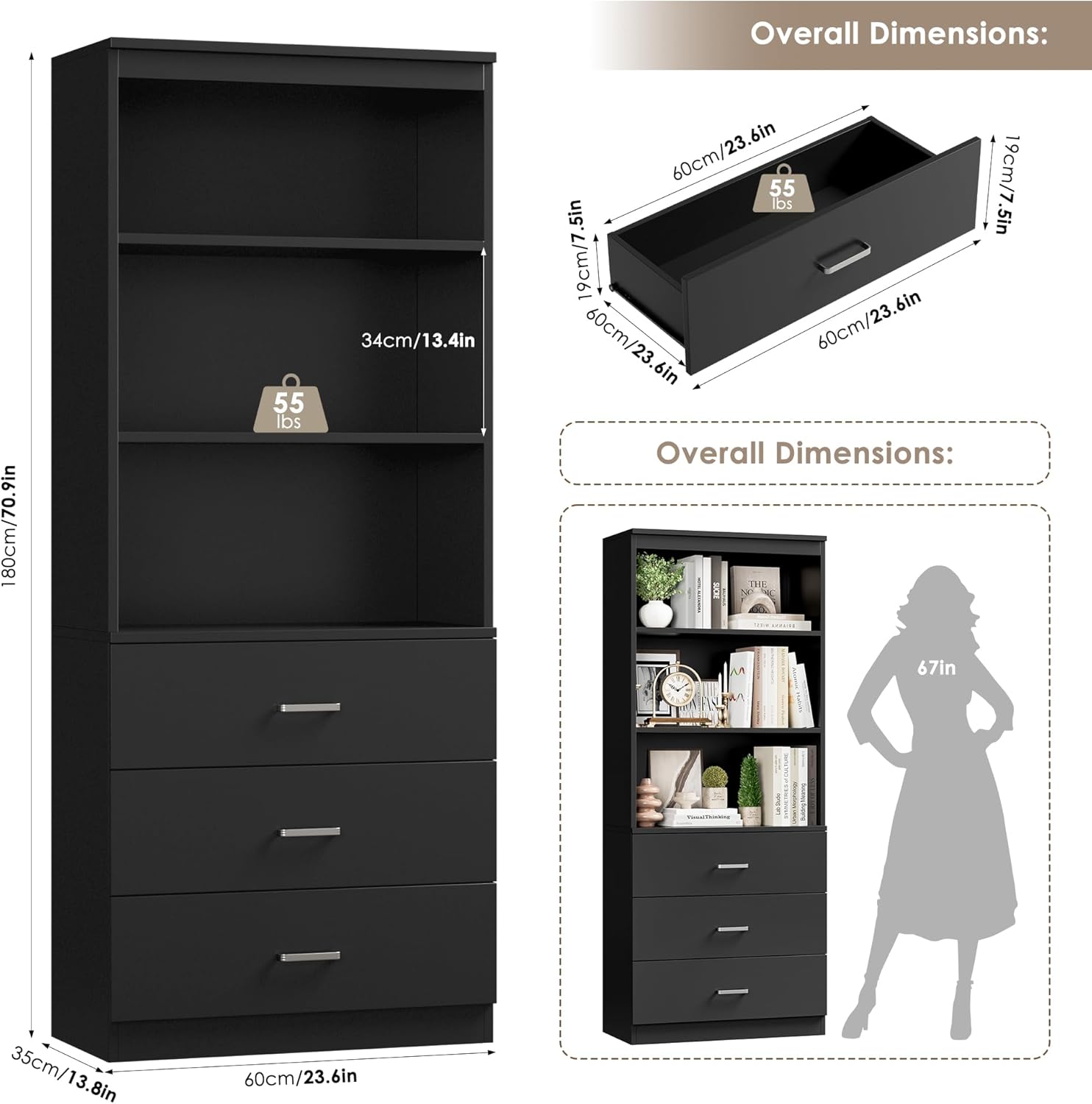 - 3 Drawers and 3 Open Shelves: 3 drawers for more discreet items and documents. 3 open shelves with baffles for decorative items or items that need to be picked up in time. Not only does the bookshelf with drawers expand your storage space and keep your room tidy, but it also makes your life and work easier.