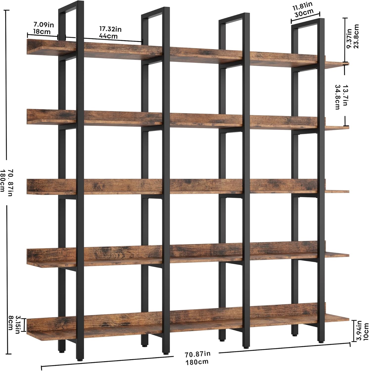 - Bookcase Dimension: 70.9” H x 70.9” W x 11.8” D; Each shelf holds up to 220 lbs and has a height of 13.7 in